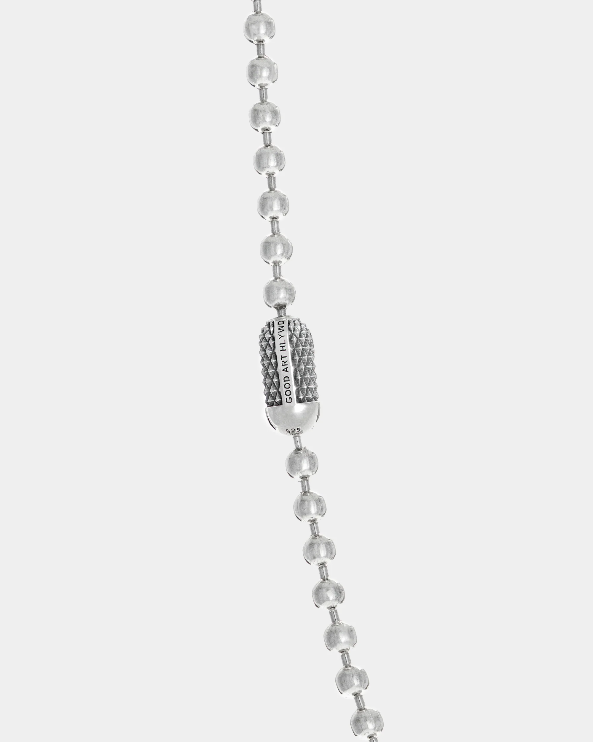 The Poplock aligns with a Good Art tradition of not leaving well enough alone. Our patented pill-shaped clasp may look familiar but it's mechanism is novel. Inside hides a spring loaded plunger that holds the last ball in place. Pop the ball into the jaws and you're good to go. To remove it, move the chain perpendicular and pull to open up. The actions make a snappy sound. The old version worked fine, this one works fun. Every time.