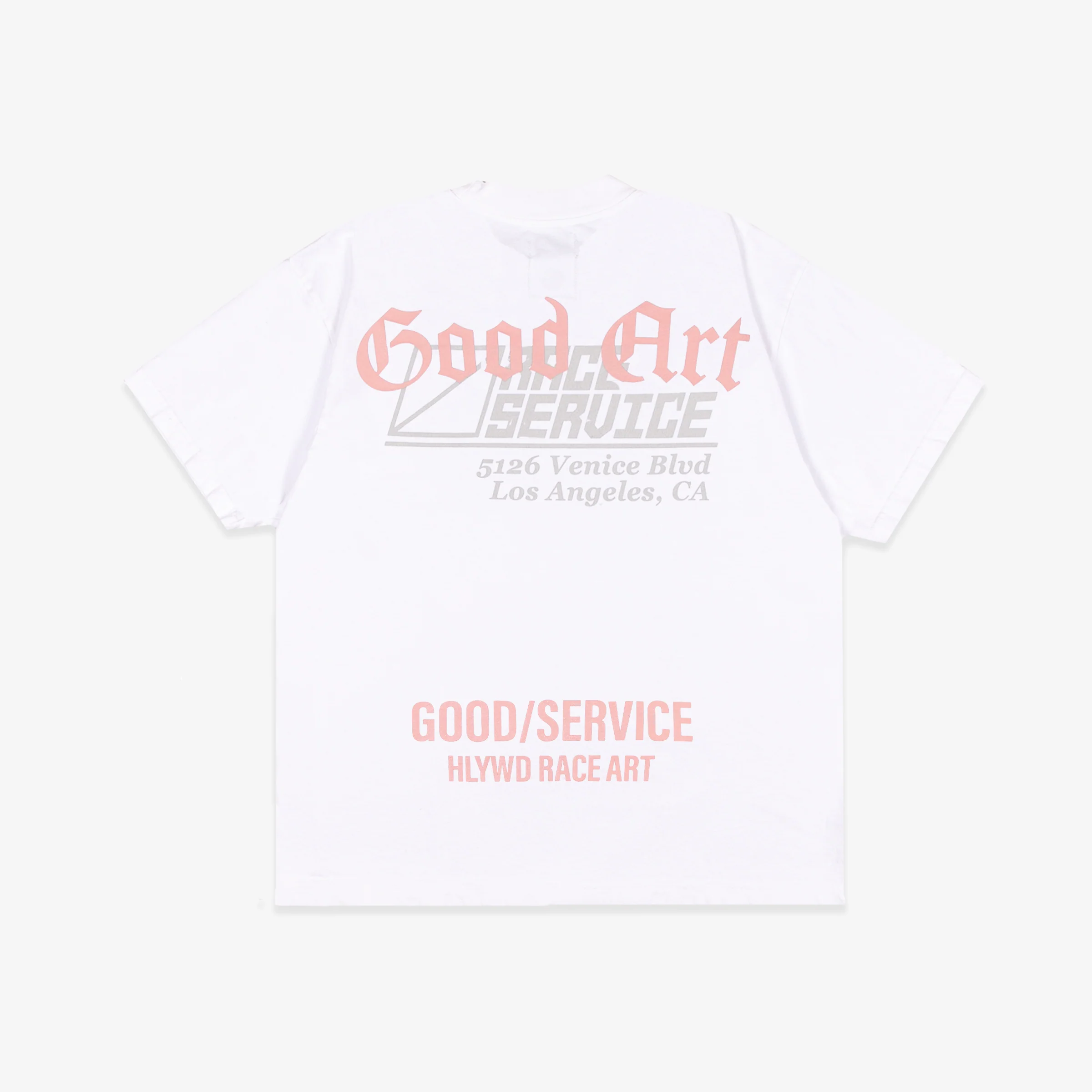 The Race Service x Good Art t-shirt combines graphic storytelling with minimalist craftsmanship. Constructed from mid-weight cotton and silkscreen printed in Los Angeles, it features branding details across the chest and back.