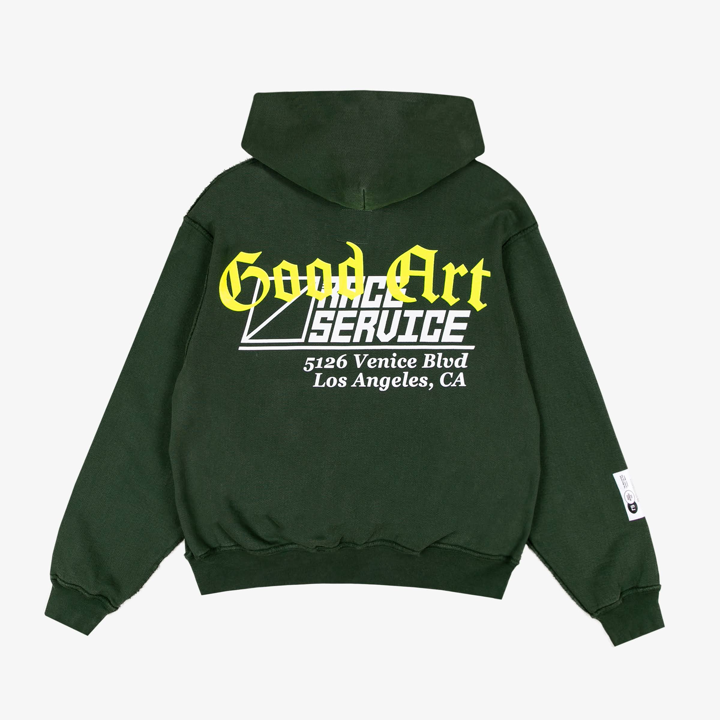 The Race Service x Good Art hoodie is a heavy-weight cotton terry with exposed seams and a cropped fit. Made of 100% cotton French terry.